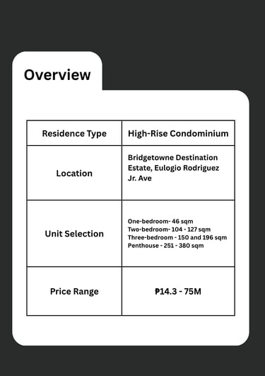 Le Pont Residences is Robinsons Land’s premier high-rise residential development in Bridgetowne, a thriving destination estate that bridges Pasig and Quezon City. Residents enjoy panoramic views of the Ortigas and C5 corridor, surrounded by lush green spaces and riverfront promenades.